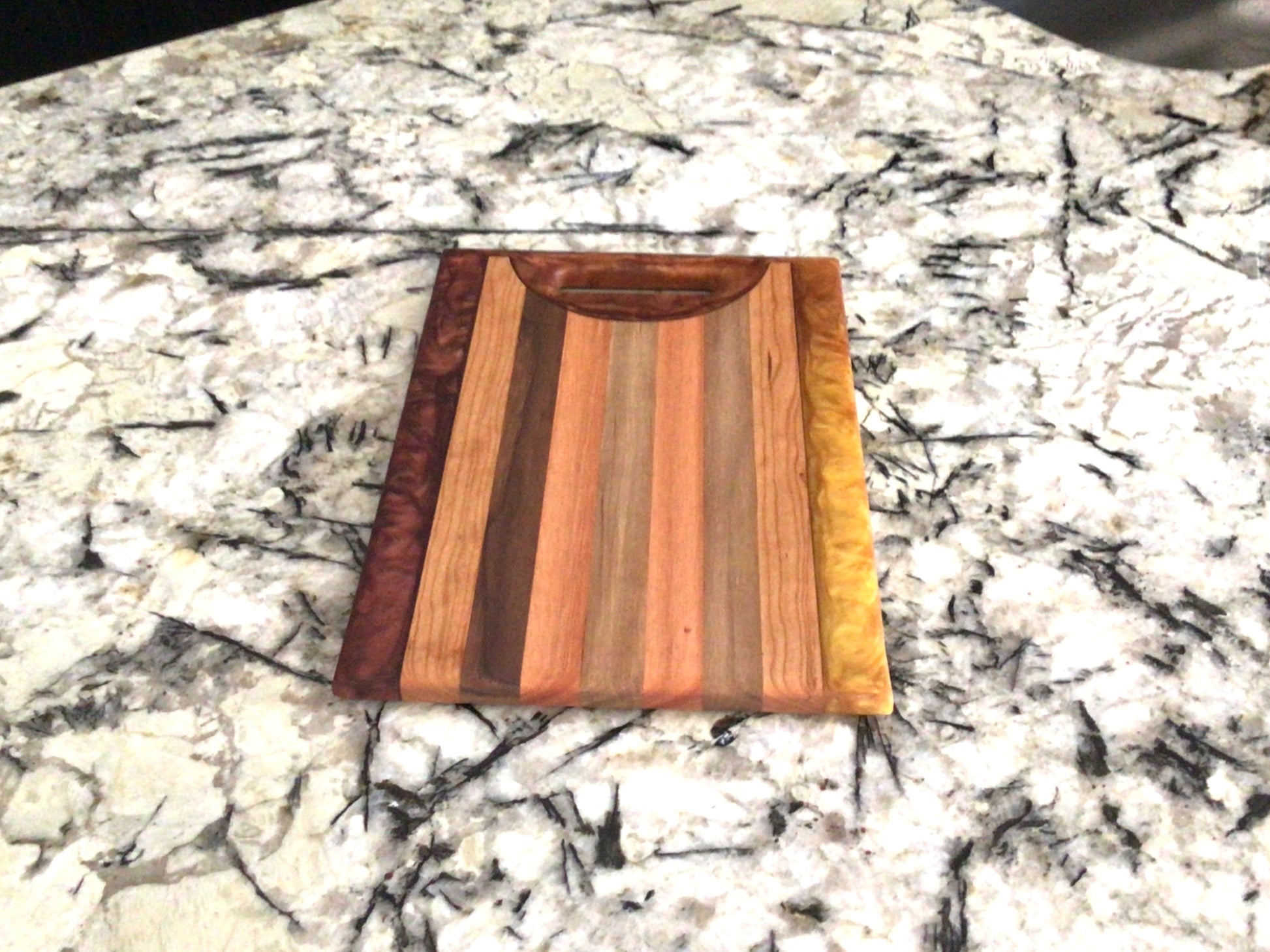 Elevate your hosting game with this stunning handcrafted charcuterie board, blending rich natural woods and bold color. Made from Red Grandis, Walnut, and Cherry, this 13" x 9" board features a striking maroon and gold epoxy river that adds a touch of luxury and school spirit to any setting.
