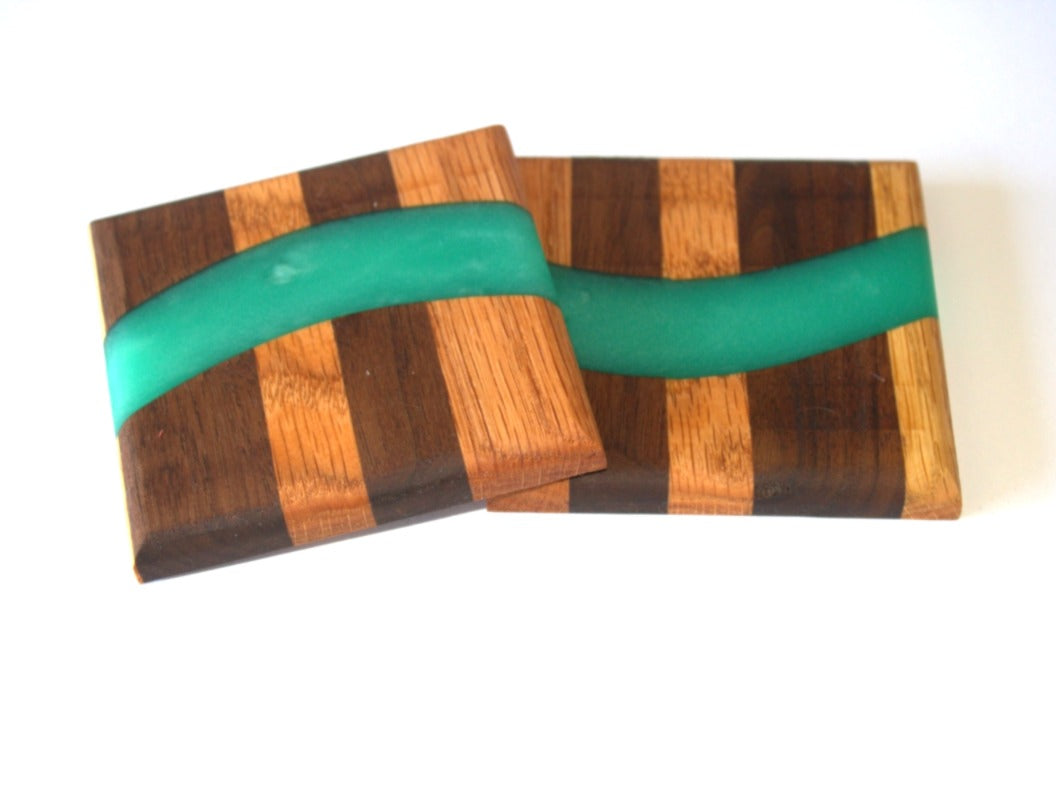 This handcrafted coaster blends the rich tones of red oak, walnut, and cherry wood with a flowing turquoise epoxy river, creating a striking contrast of natural warmth and vibrant color. Measuring 3 5/8" x 3 5/8", it’s the perfect accent for any table, offering both style and protection. Ideal for drinks, candles, or small decor. Sealed for durability and water resistance.