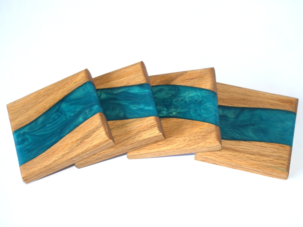 Sized at 3 5/8" x 3 5/8" square, these coasters are sealed for water resistance and durability—perfect for protecting your surfaces in style. Choose your favorite resin color and wood type to match your space or gifting needs. A unique, functional piece of art for any table.