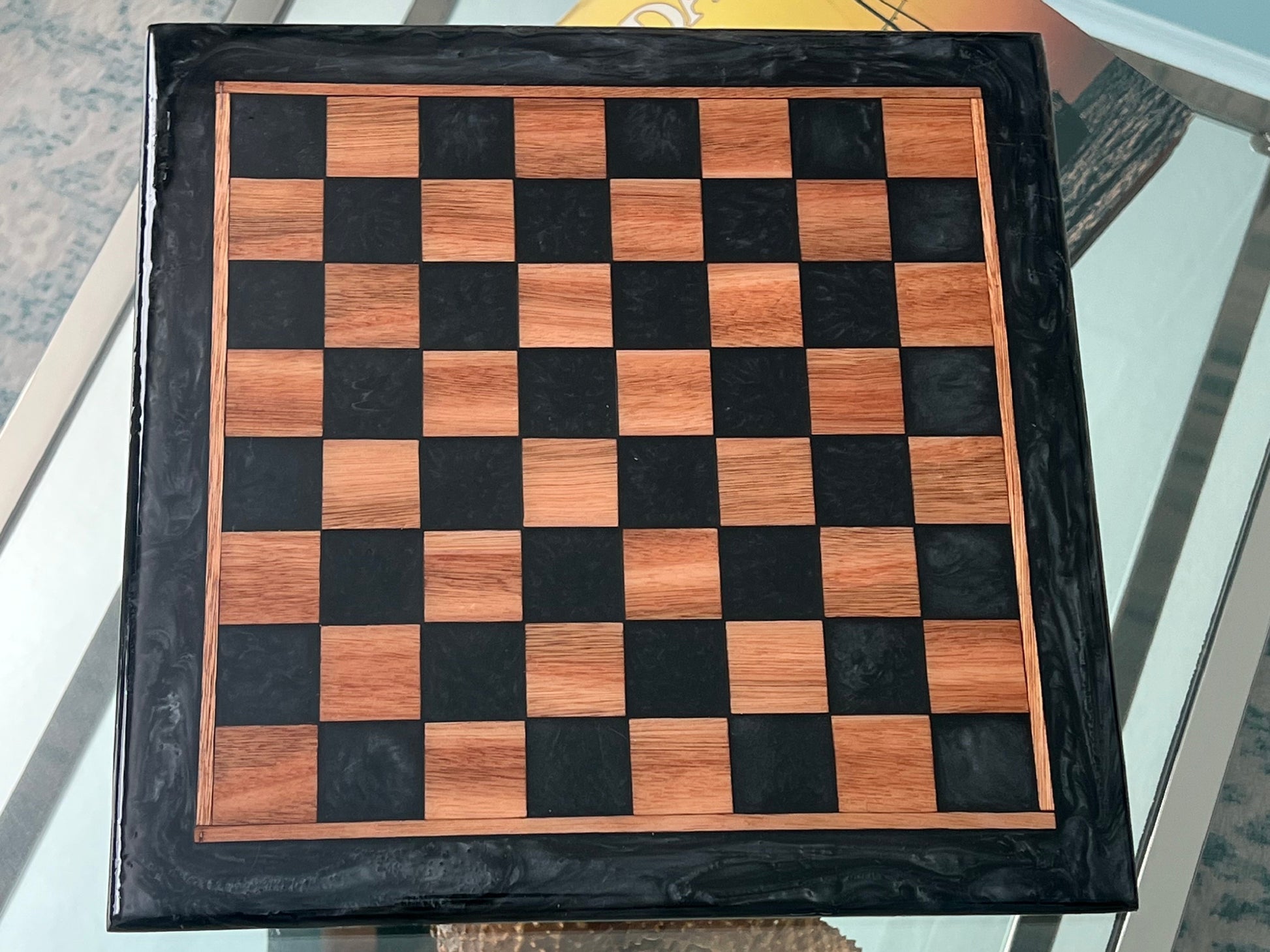 This handcrafted 13" x 13" chess board combines the warmth of Red Grandis wood with the sleek elegance of dark green and black epoxy. Designed with versatility in mind, the board features black squares on one side and dark green squares on the other, giving you two distinct looks in one. The rich wood grain and glossy resin create a modern, eye-catching piece that’s perfect for both playing and displaying. A bold addition to any game room or living space!