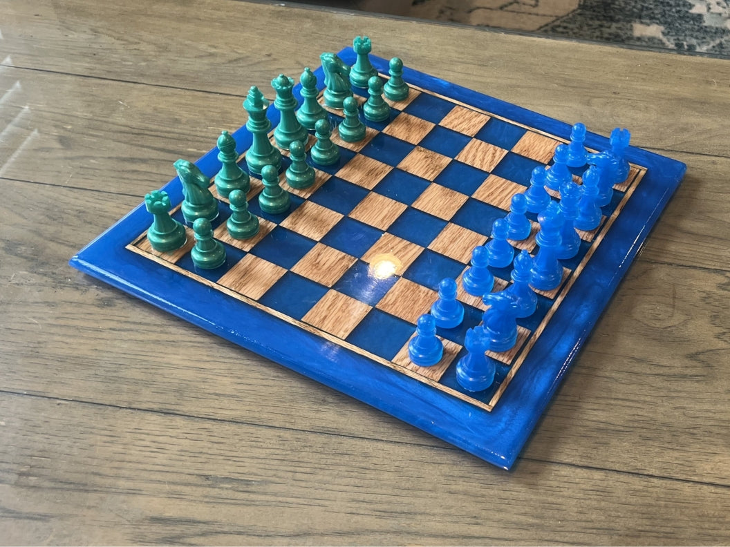 Add a bold splash of color to your next match with this handcrafted 13" x 13" chess board, made from rich Red Oak and vivid blue and green epoxy. The alternating squares combine natural wood grain with shimmering resin, creating a stunning visual contrast that's both modern and timeless. The board is framed in a solid blue epoxy border with a smooth finish that feels as elegant as it looks. Perfect for display or play, this unique board turns every game into a showpiece. (Chess pieces not included!)