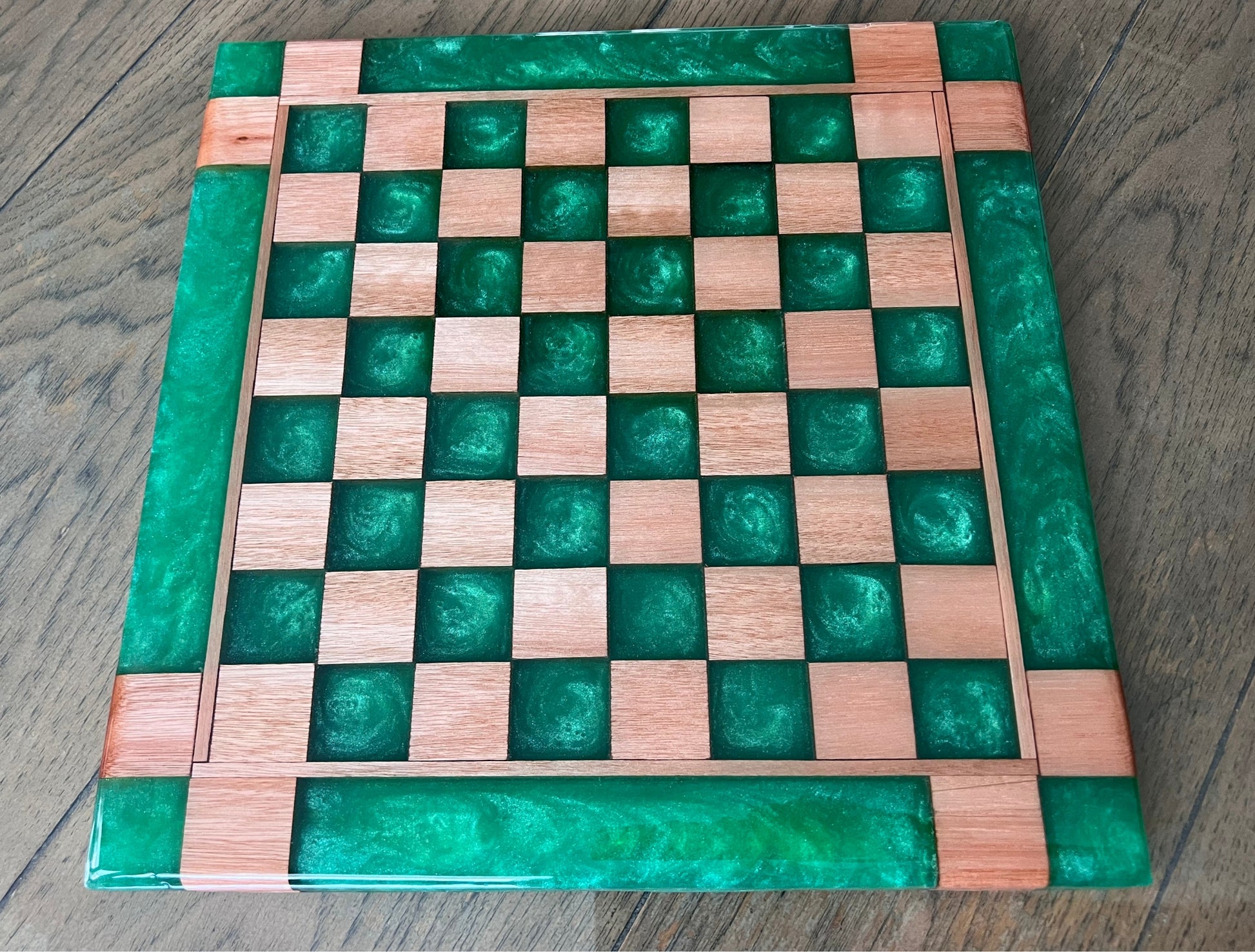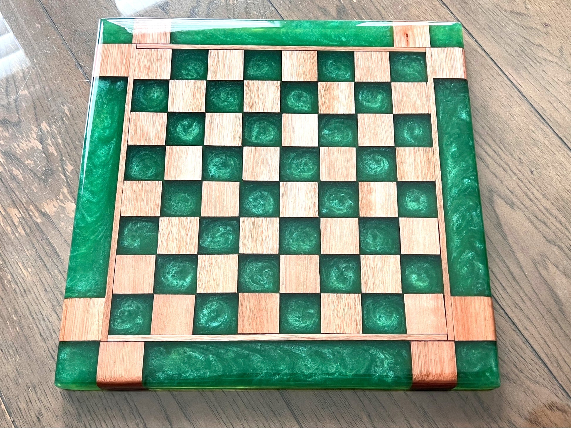 Bring timeless strategy and modern craftsmanship together with this handcrafted chess board. Made from rich Red Grandis wood and poured with a stunning green epoxy river, this board showcases a unique fusion of natural warmth and bold, modern design.