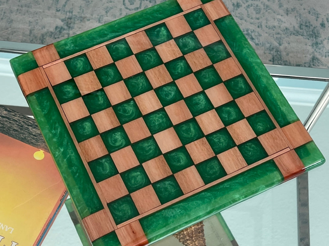 Red Grandis Wood with Turquoise Green Epoxy Chess Board – 13" x 13"