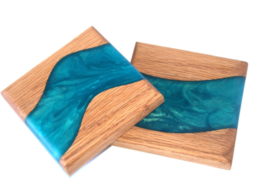 Red Oak Wood River Coasters with Pacific Turquoise Epoxy - 2 piece set - 3 5/8" x 3 5/8"