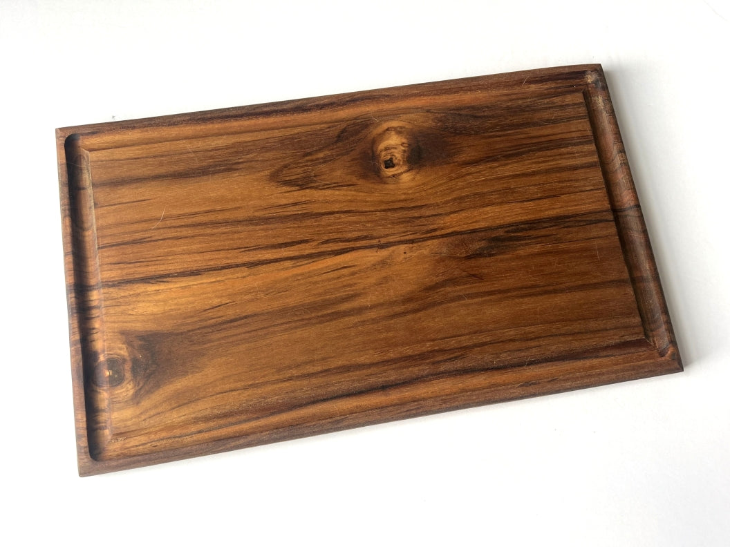 This handcrafted teak cutting board blends timeless design with everyday functionality. Made from solid teak, it features rich natural grain patterns and a warm tone that only improves with use. The routed juice groove helps capture liquids while prepping meats, fruits, or vegetables, keeping your workspace clean and contained. Naturally resistant to moisture and wear, teak is an excellent choice for a durable, long-lasting cutting surface. Finished by hand to highlight the wood’s character, this 16.5″ × 10″ board works beautifully as both a functional kitchen tool and an elegant serving piece.